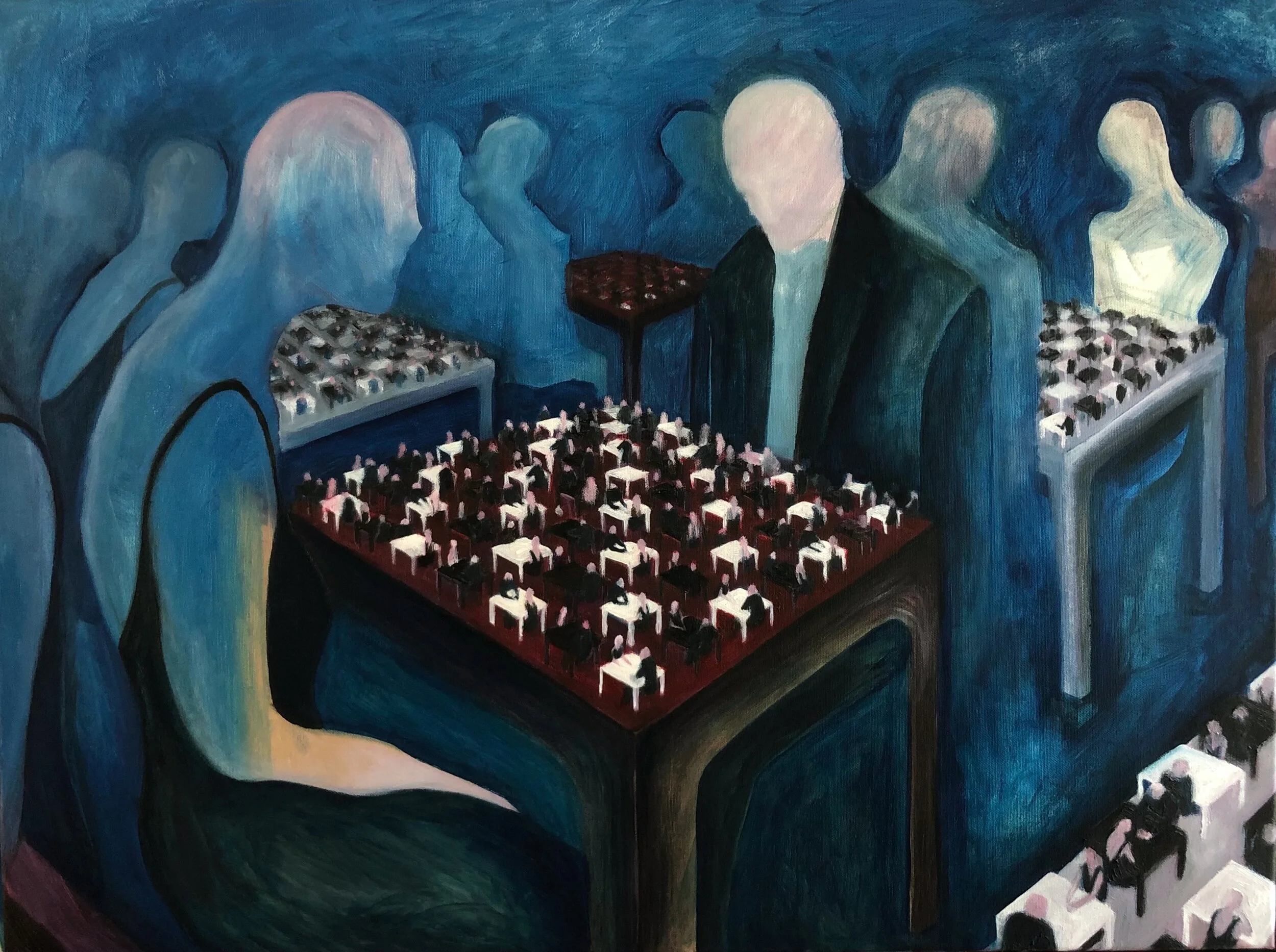 Stripped of individuality, expressionless figures are strategically situated within a gamified landscape as they operate each other like pieces on a chessboard.